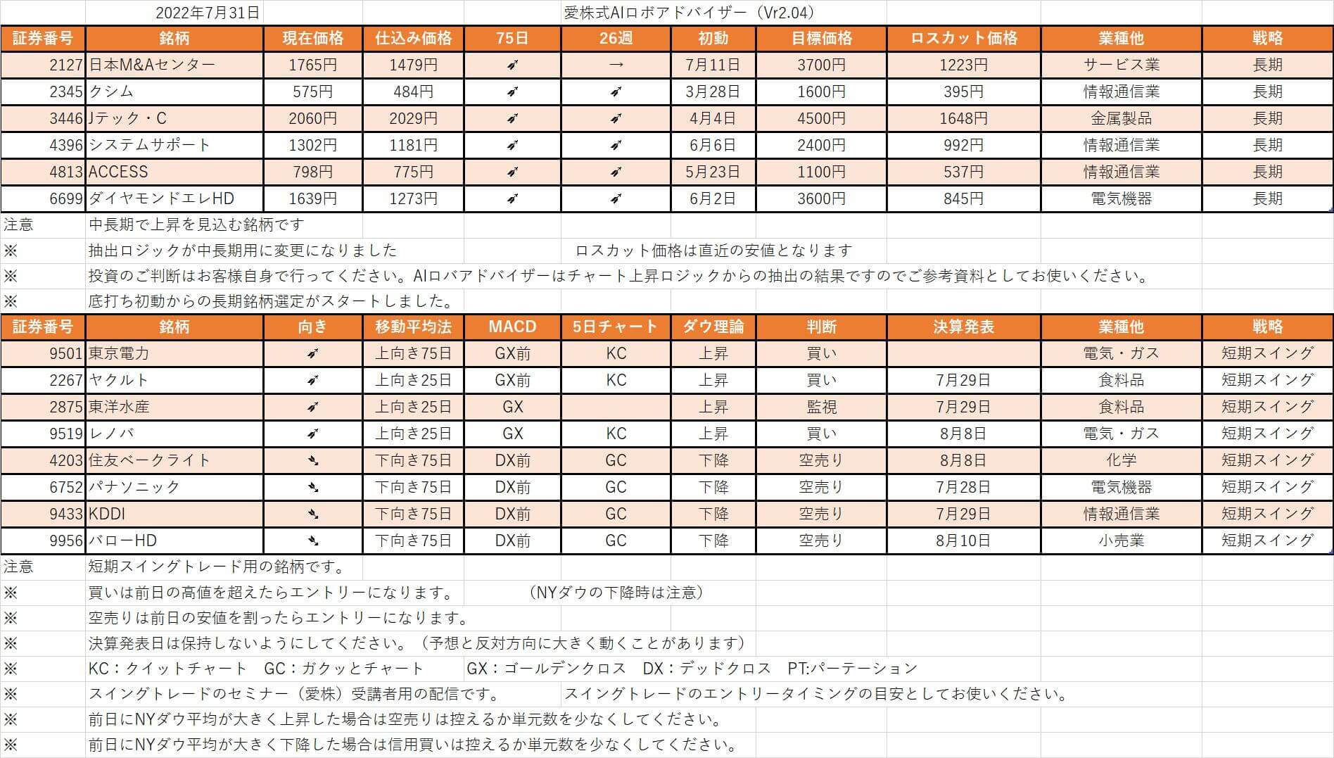 【ドラゴンAI株、厳選銘柄情報】最終更新 2022/8/08